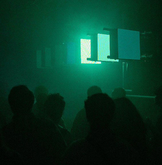 Created for the third Migarden event at NAMA, the work staged a conceptual play of symmetry and opposition. Eight LED wall tiles, arranged front and back in a linear sequence, displayed green on one side and red on the other, shifting the space’s atmosphere depending on the viewer’s position. This chromatic duality invited movement across the room, while animations synchronized with the audio flowed along the composition, translating musical variation into a dynamic dialogue between sight and sound. Within this mirrored setup, the installation transformed perception into an active, spatial experience.